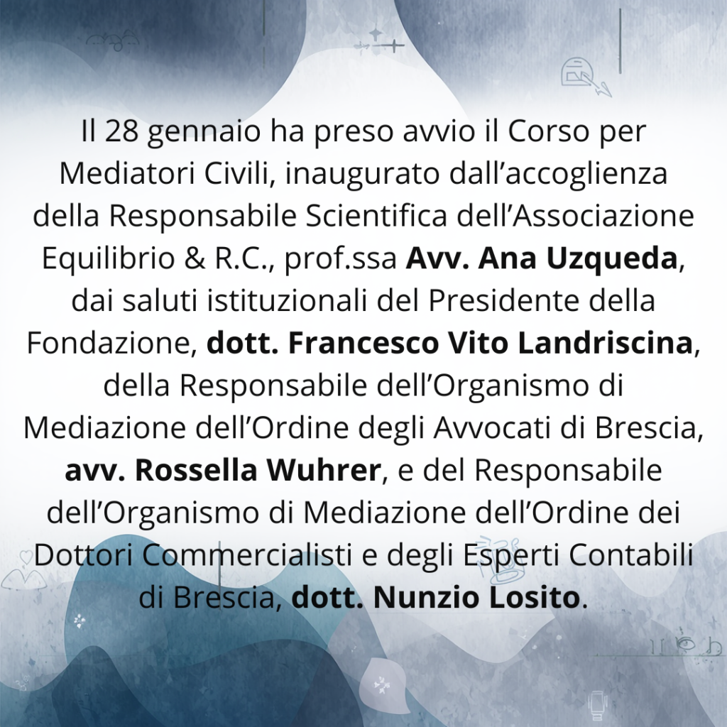 L’Associazione Equilibrio & R.C. (iscritta al numero 008 del Registro del Ministero della Giustizia per la formazione di mediatori in ambito civile e commerciale e come Organismo di mediazione nell’elenco ministeriale) è un ente pioniere in Italia nella formazione dei mediatori.