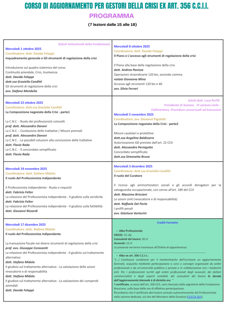 La Fondazione Bresciana per gli Studi Economico-Giuridici, in collaborazione con l’Ordine dei Dottori Commercialisti e degli Esperti Contabili e l’Ordine degli Avvocati di Brescia, organizza un corso di formazione dedicato alla gestione della crisi d’impresa, rivolto ai professionisti iscritti nell’Albo dei Gestori della Crisi d’Impresa.