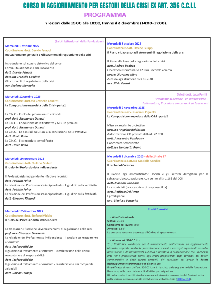 Il percorso formativo erogato dall’Università degli Studi di Brescia in collaborazione con la Fondazione Bresciana per gli Studi Economico-Giuridici, con l’Ordine dei Dottori Commercialisti e degli Esperti Contabili e con l’Ordine degli Avvocati di Brescia è rivolto ai professionisti che intendono iscriversi nell’apposito nuovo Albo dei Gestori della Crisi d’Impresa, istituito dal Ministro della Giustizia con Decreto 3 marzo 2022, n. 75.