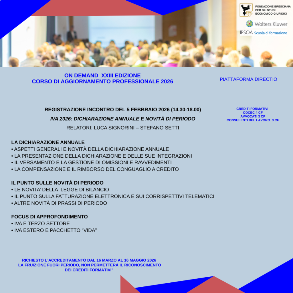 La quota è esente Iva – ex art.10 c.1 n. 20 dpr 633/72 – solo se la fattura viene intestata ai professionisti (o studi professionali associati e STP) iscritti agli Ordini di Brescia (Dottori Commercialisti, Avvocati, Notai e Consulenti del Lavoro di Brescia); diversamente l’aliquota da applicare è del 22%.