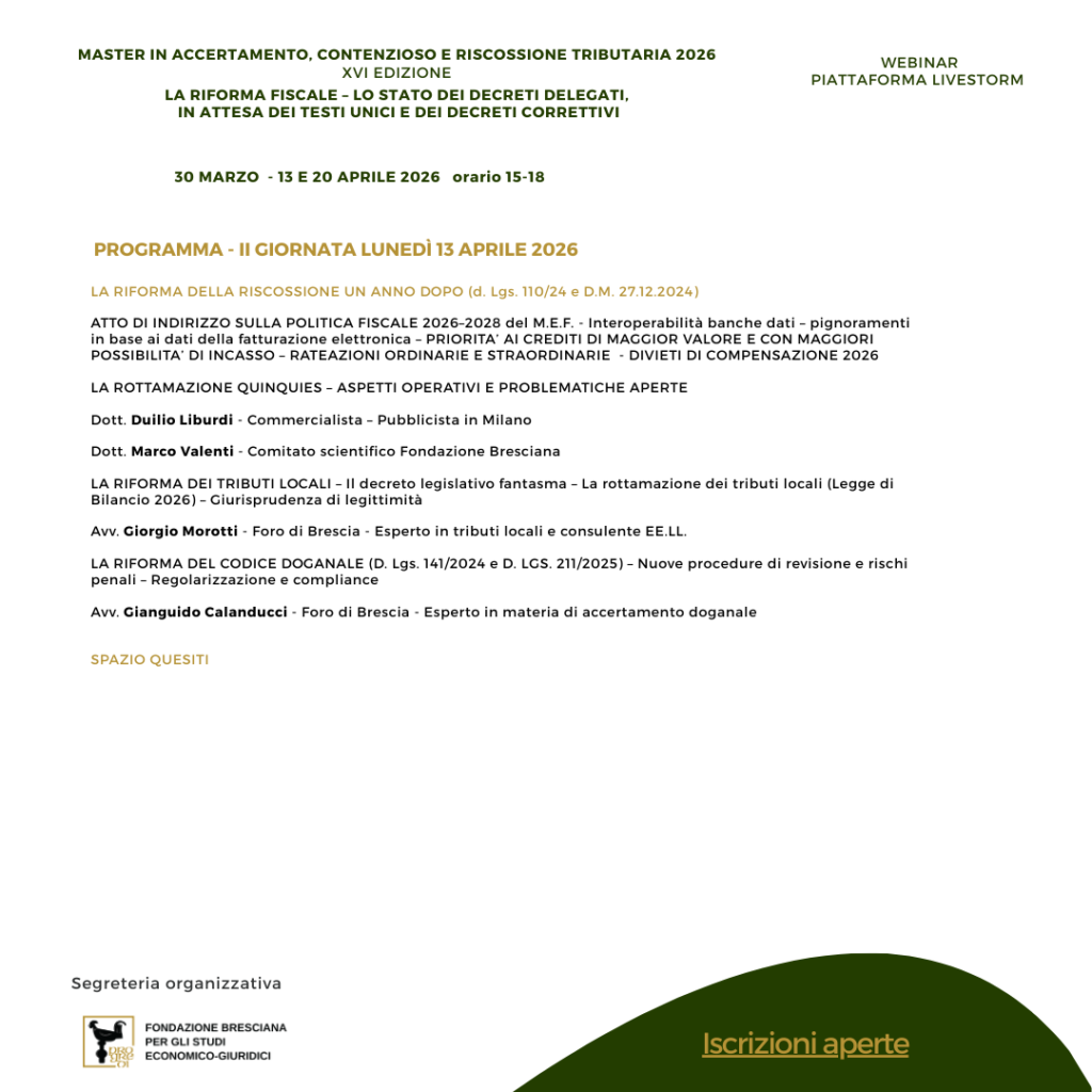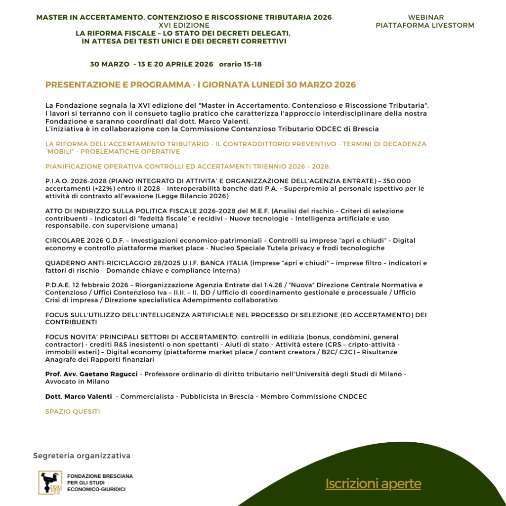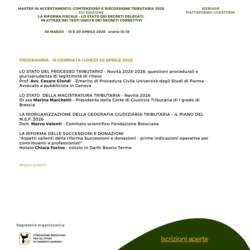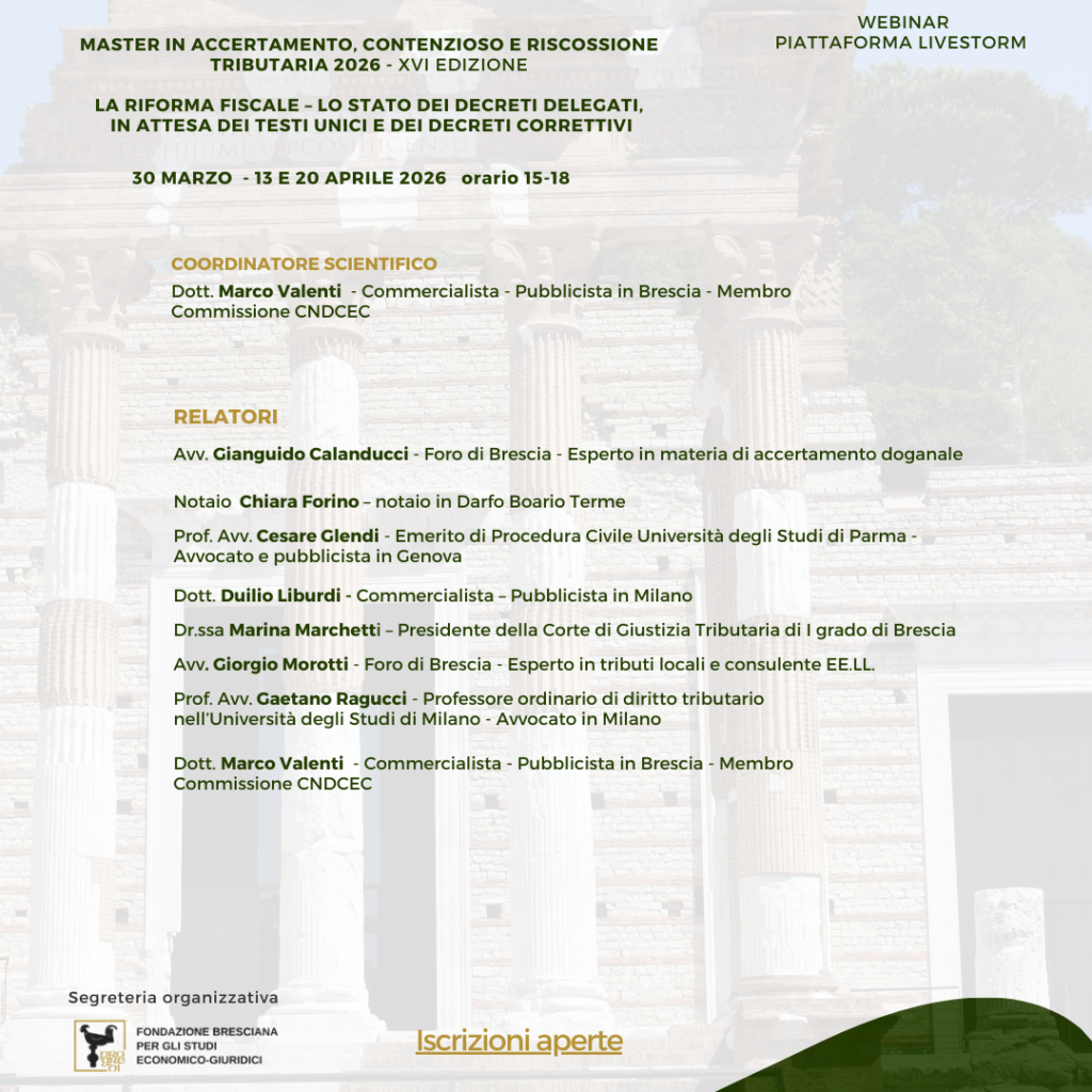 L’iniziativa è in collaborazione con la Commissione Contenzioso Tributario ODCEC di Brescia